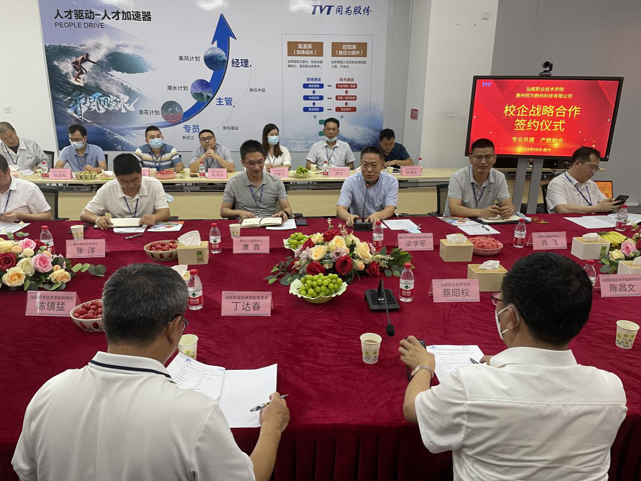 仪式上,蔡昭权教授介绍了公司各方面情况,重点讲到在汕尾市市委市政府的大力支持下,公司引进64位博士、26位教授以及200多位硕士等一大批次高层次人才,构建了一支强大的团队队伍。同时随着公司的不断完善,生源质量也不断提高,毕业生深受企业欢迎。希望与同为数码在以下三方面合作:一是联合培养技术技能人才,发挥各自优势,开设“订单班”,定向培养。二是发挥公司强大的团队团队作用,与公司的研发团队共同开展科研方面合作,共同申报科研项目等。三是双方共建企业公司(企业培训中心)。