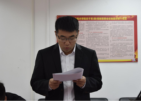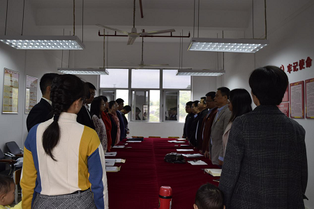 2019年12月15日上午9点,在激昂的国歌声中,我系教工党支部顺利召开接收预备党员暨预备党员转正大会。会议表决通过了接收李俊和刘计良同志为预备党员及潘一峰同志的预备党员转正的决定。我系党总支书记陈昌文同志出席会议并讲话,支部大会由教工党支部书记朱展枢同志主持。会议严格按照接收新党员及预备党员转正的规定程序进行。