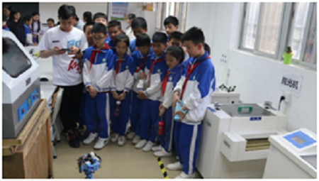 随后来到我系105实验室观看我系员工设计制造的优秀作品,小朋友们对仿生机器人和航模的喜欢溢于言表,眼里都能看到小星星,带队的老师也赞不绝口。