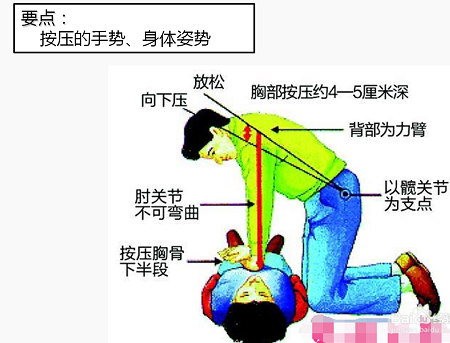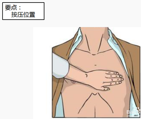 6、胸外心脏按压:两乳头连线中点(胸骨中下1/3处),用左手掌跟紧贴病人的胸部,两手重叠,左手五指翘起,双臂伸直,用上身力量用力按压30次(按压频率至少100次∕分,按压深度至少5CM)
