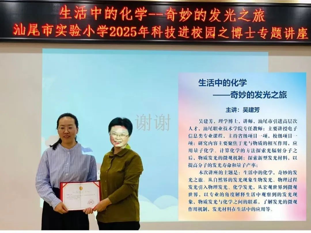 讲座临近尾声,吴博士鼓励同学们保持对科学现象的关注,勇于探索未知,强调科学就在身边,只要用心观察、勤于思考,每个人都能成为科学探索的小先锋。活动最后,汕尾市实验小学董事长向吴博士表达了诚挚的感谢,并颁发了感谢证书,同学们也纷纷上台与吴博士合影留念,定格下这珍贵的科学记忆。
