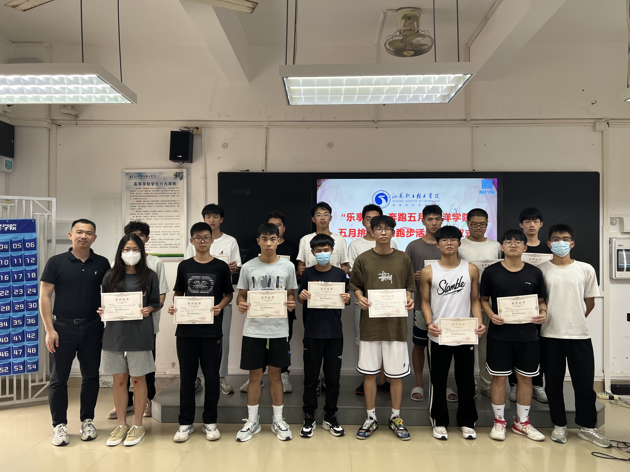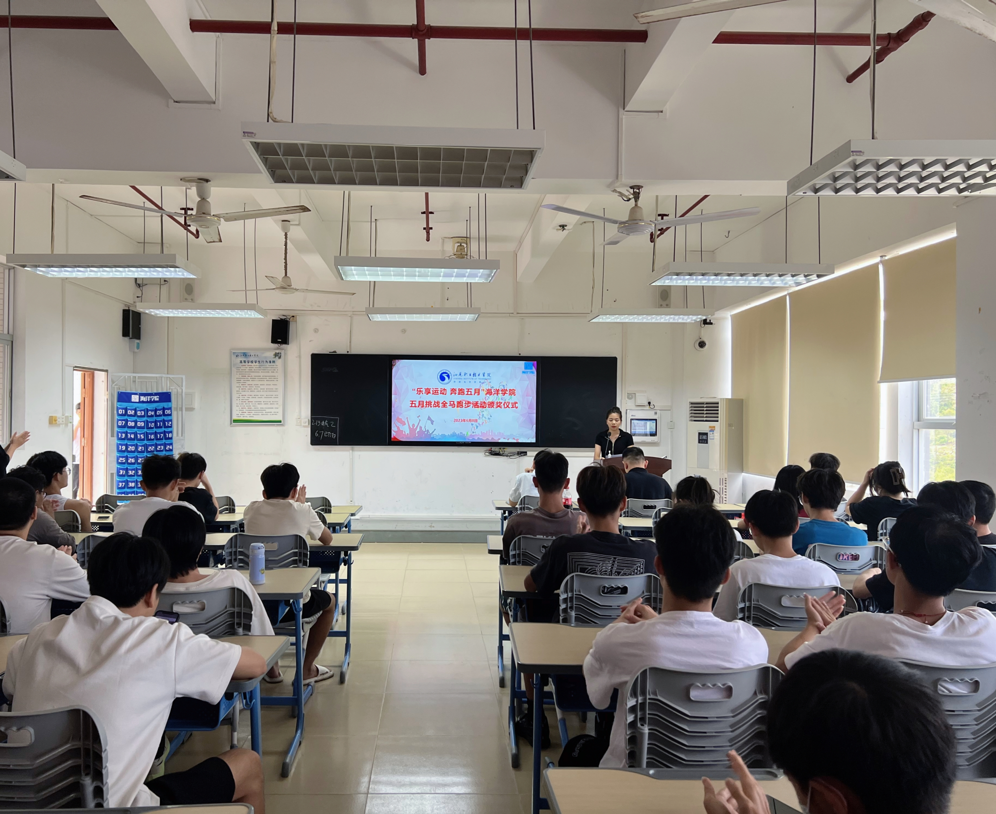 6月8日中午十二点半,SUNBET申博第二届五月全马挑战活动总结表彰仪式在求真楼803教室举行。近三百名同学参加了此次挑战全马活动。此次表彰仪式不仅是对同学们一个月坚持不懈的奖励,也是同学们在老员工活中一次独特的记忆。这一个月以来,同学们一起在田径场上挥洒汗水,不仅身体得到了锻炼,还结识了很多志同道合的伙伴。