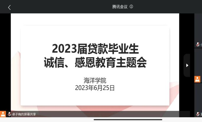 会议中,卓老师详细、全面地介绍和讲解了国家助学贷款基本知识、国家开发银行生源地助学贷款员工在线系统功能、还款相关知识、提前还款流程、违约责任、个人征信知识等内容,鼓励有条件的同学做好提前还款计划,并通过实际案例来讲解贷款违约的严重后果,强调诚信还贷的重要性。对于同学们提出的疑问和困惑,卓老师一一进行了详细的解答。最后,卓老师提醒同学们提高防诈骗意识,谨防受骗,并表达了对全体2023届贷款毕业生心怀感恩、诚实守信,如期还贷的期望。