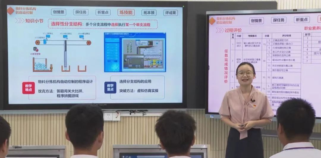 本次大赛中,该团队对公司智能制造专业群核心课“PLC基础与应用”教学内容进行重构,基于工作岗位要求,设计典型项目,以“基于PLC控制的智能工业应用”为参赛内容,分别选取“机器人编程与调试”“物料分拣机构的自动控制”“交通灯的自动控制”“机器人上下料搬运”教学内容拍摄教学视频,充分地展示了团队各教师不同的教学风格和教学方法。