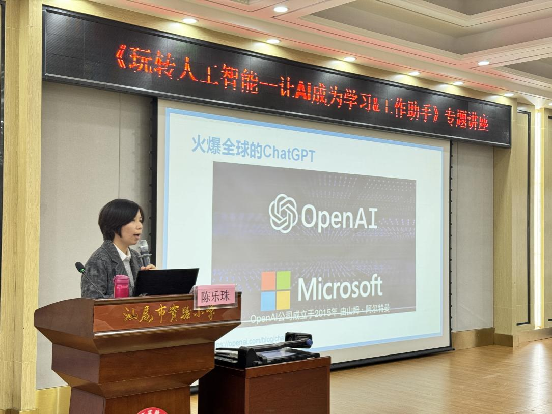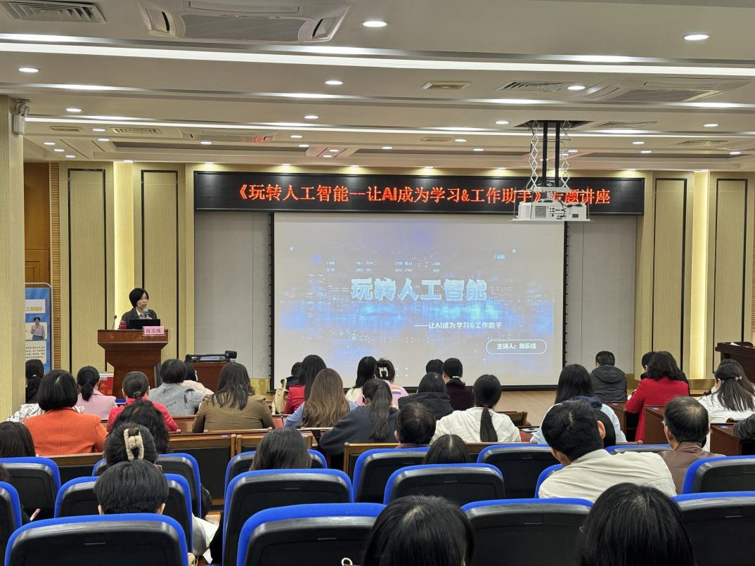陈乐珠老师以ChatGPT技术为主线展开讲解。她介绍了ChatGPT的应用背景、特点及发展趋势,重点阐述如何在日常公司产品工作中运用国内AI应用助手开拓教学思路,高效转化学习成果。讲座尾声,陈乐珠老师指出AI作为辅助工具之一,使用者提出问题越精准,得到的答案越高质量,也将极大地促进教师们的教学质量。