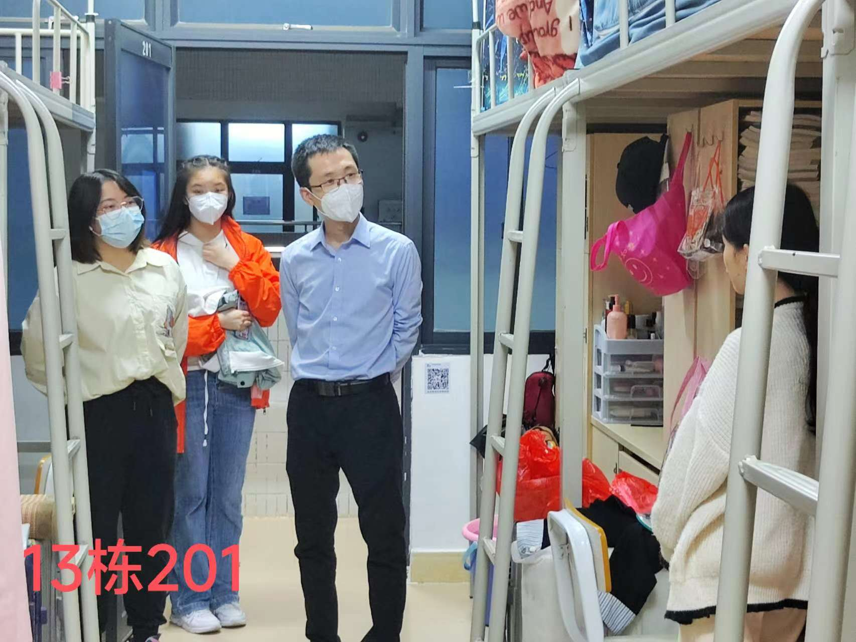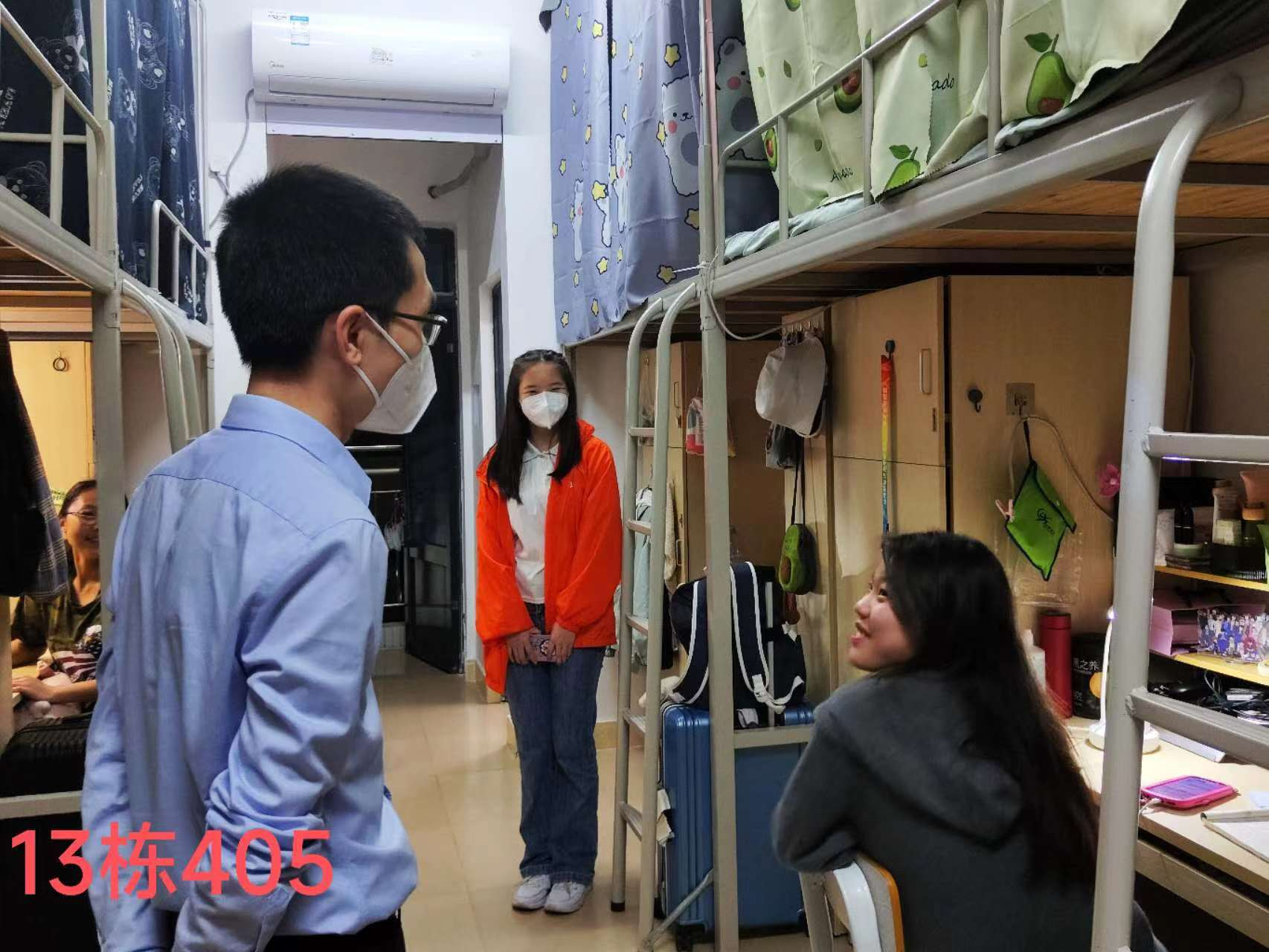 2023年2月13日晚,SUNBET申博党总支副书记、副经理陈倚重带领全体辅导员和员工会干部一同走访员工宿舍,实地了解员工开学返校后的学习生活情况,为员工们送上公司关怀。