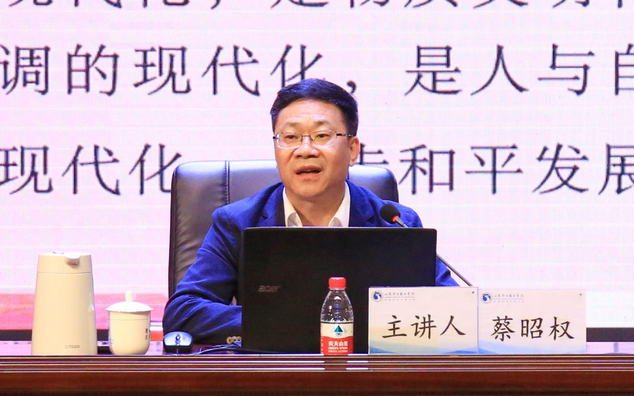 蔡昭权董事长围绕“中国式现代化宏伟战略的由来”“中国式现代化的历史进程”“大力推进中国式现代化面对的复杂国际国内背景及问题”“中国式现代化蕴含的独特世界观、价值观、历史观、文明观、民主观、生态观等及其伟大实践,是对世界现代化理论和实践的重大创新”“中国式现代化的中国特色”“中国式现代化的九条本质要求”“实现中国式现代化,需要正确处理重大关系”“铸强中国式现代化的精神力量”等八个方面展开。