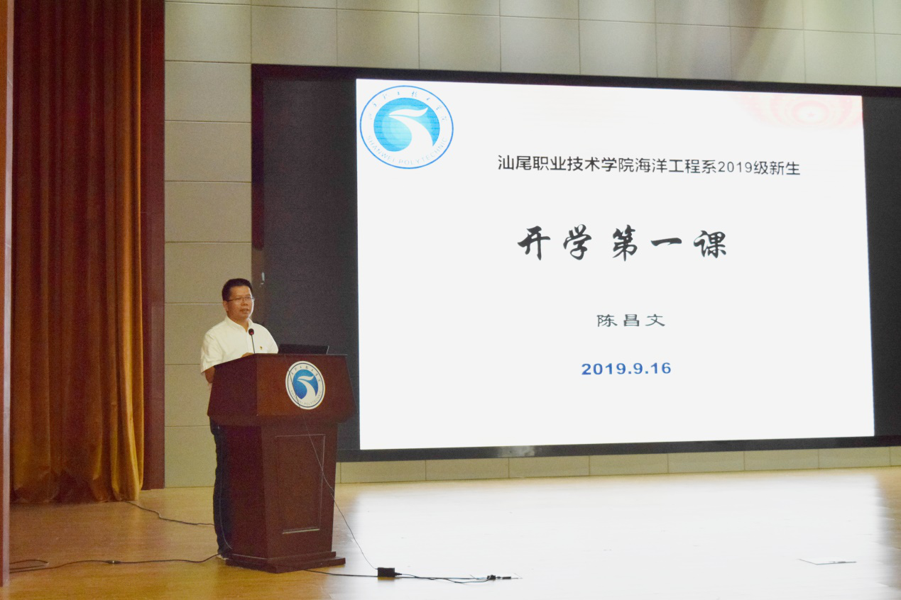 第三部分,陈昌文主任给全体新同学上了题为“重新出发”的第一课,陈主任以幽默风趣的语言,为新同学介绍了海洋工程系年轻而又充满斗志的教师团队。为让新同学进一步了解汕尾,陈主任还以汕尾历史沿革为主线,给新同学们讲述了公司的发展,汕尾的历史变迁。最后,陈主任详细分析了深汕深化合作、智能制造专业群建设大背景下,给汕尾这座滨海城市带来的机遇,他鼓励同学要抓住机遇,最大限度地修正自己。