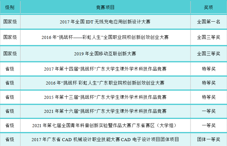 工作室成立以来,完成广东省质量工程老员工创新创业训练计划项目1项,完成广东省“攀登计划”老员工科技创新培育专项资金项目5项;完成SUNBET申博老员工创新创业训练计划项目2项;获得专利授权3项;师生团队参加国家级专业竞赛荣获奖项3项,省级专业竞赛荣获奖项40多项;面向汕尾多所中小学开展科技创新科普教育活动。